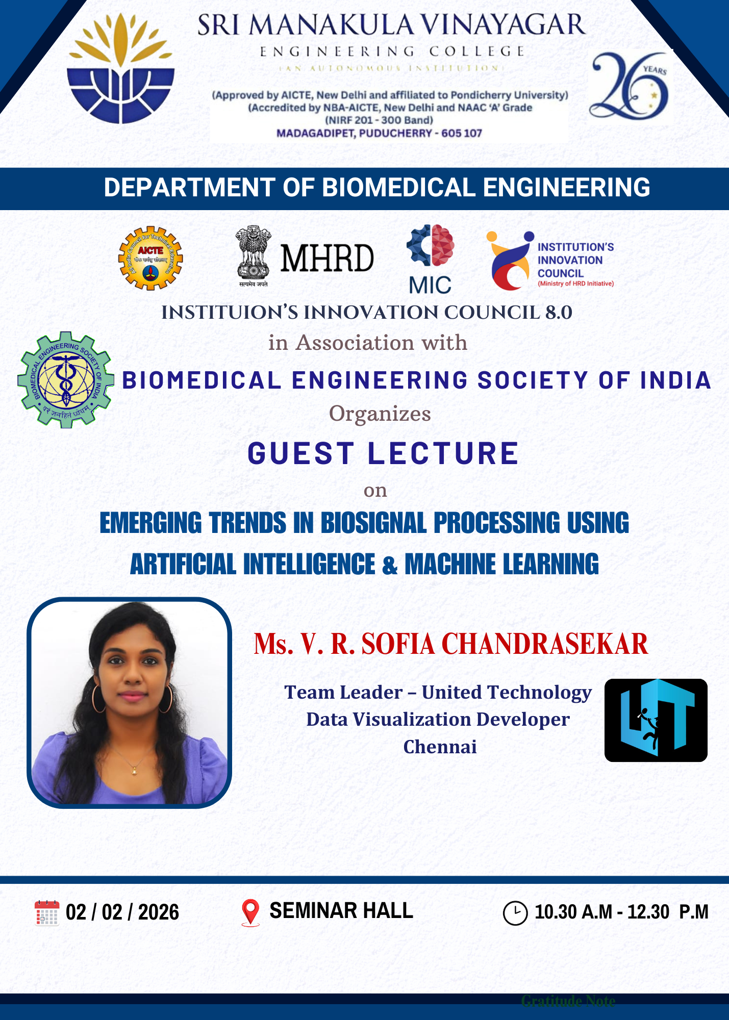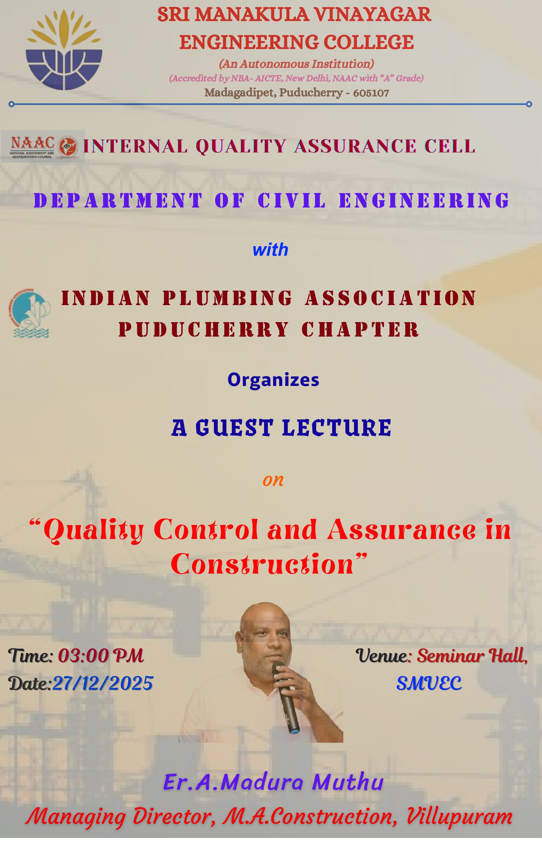 Sri Manakula Vinayagar Engineering College, affiliated to Pondicherry University is among the leading engineering college in Pondicherry and Tamilnadu. It was established in the year 1999 under the umbrella of Sri Manakula Vinayaga Educational Trust, with a vision to offer quality and affordable technical education to the weaker sections of the society. The institution has obtained autonomous status in the year 2019 and commemorated its Silver Jubilee in the field of educational excellence. At the apex of its standardization, the institute has been accredited by National Assessment and Accreditation Council (NAAC) with “A” grade.
