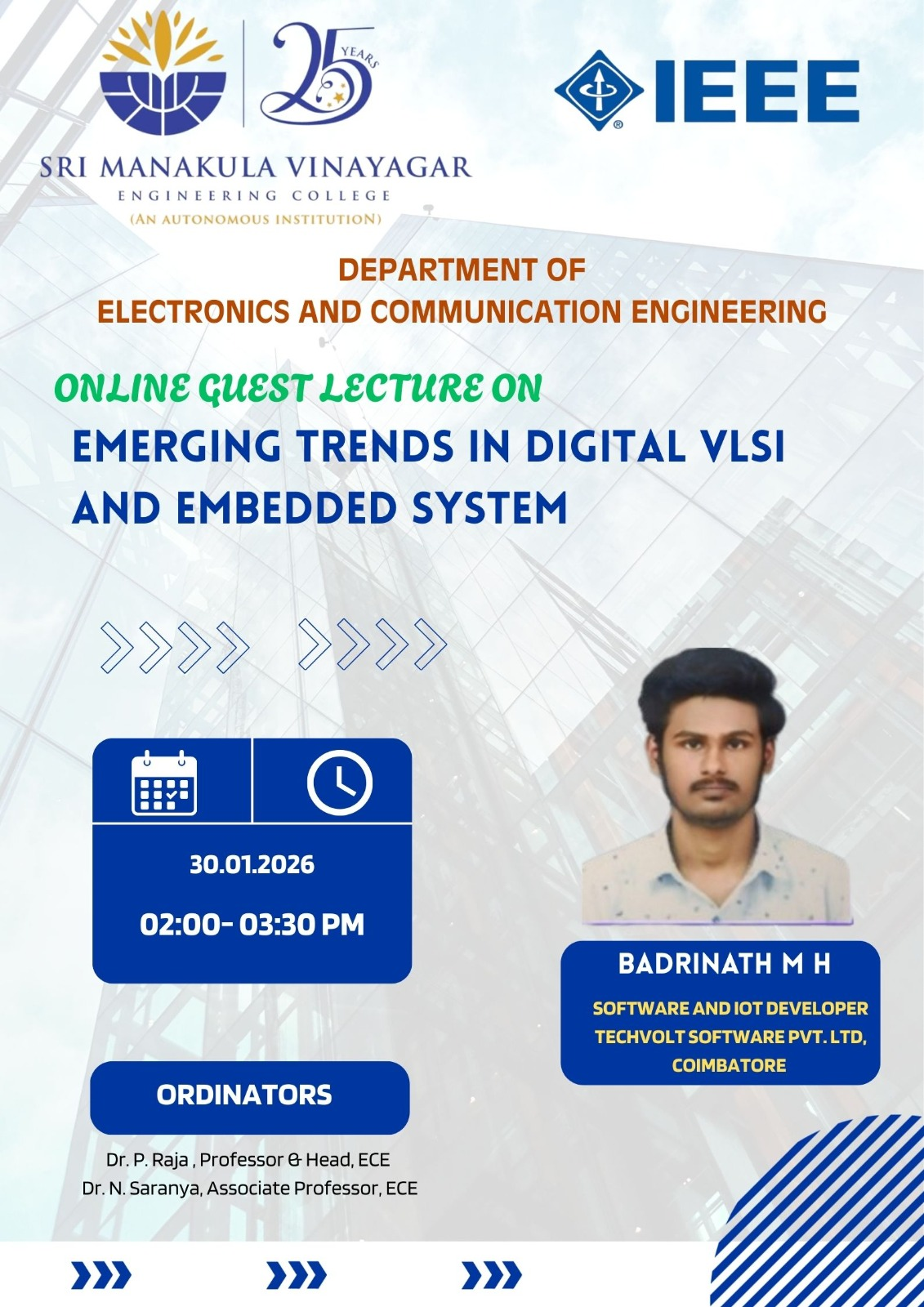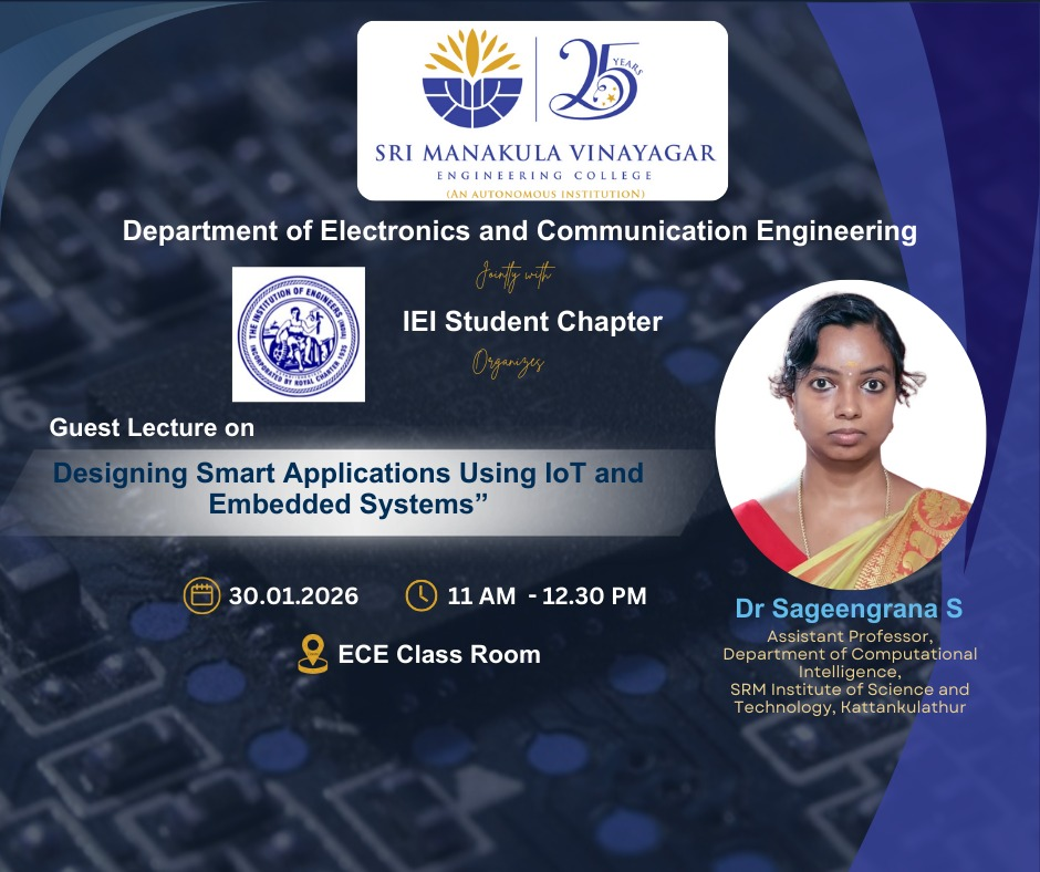 Enhance your skills with exclusive M.Tech programs offered at Manakula Vinayagar Engineering College. These programs specialize in fields like Electronics and Communication Engineering, Manufacturing, Networking, VLSI and Embedded Systems, and Artificial Intelligence, and are tailored to align with the industry’s requirements.