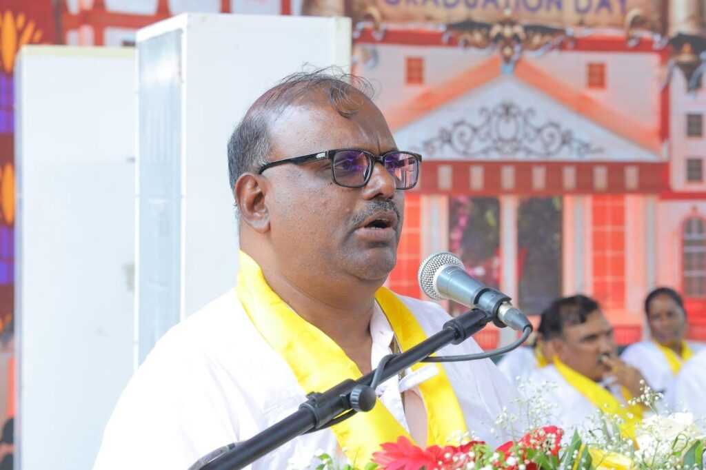 The Felicitation Address was delivered by Shri D. Rajarajan, Treasurer, who congratulated the graduates on successfully completing their academic journey. In his address, he emphasized three important aspects for success: clarity in career goals, the power of compounding through consistent daily efforts, and the effective use of emerging technologies like AI to enhance productivity. He encouraged students to continuously develop their skills and adapt to technological advancements. He also highlighted the importance of collaboration and staying connected, and invited graduates to register in the institution’s alumni portal to remain engaged with the college community and support future initiatives.