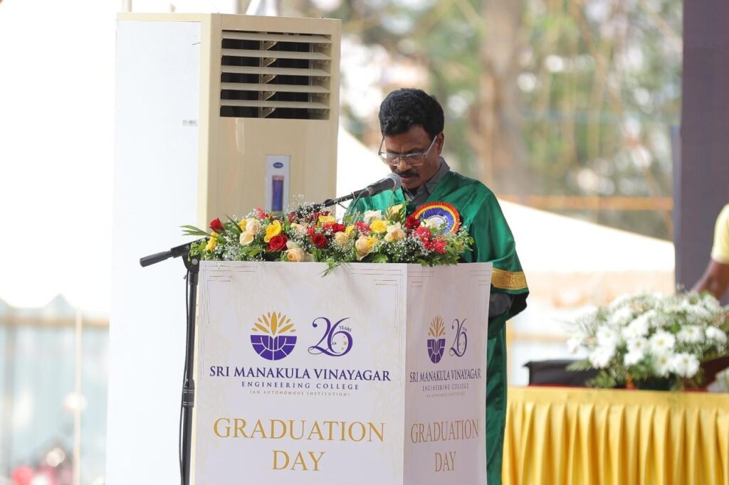 The Gratitude Note was delivered by Dr. S. Jayakumar, Controller of Examinations, who expressed sincere thanks to all the dignitaries, management members, faculty, parents, and graduates for their presence and support in making the 21st Graduation Day Ceremony a grand success. He also congratulated the graduates on their achievements and wished them success in their future endeavours.
