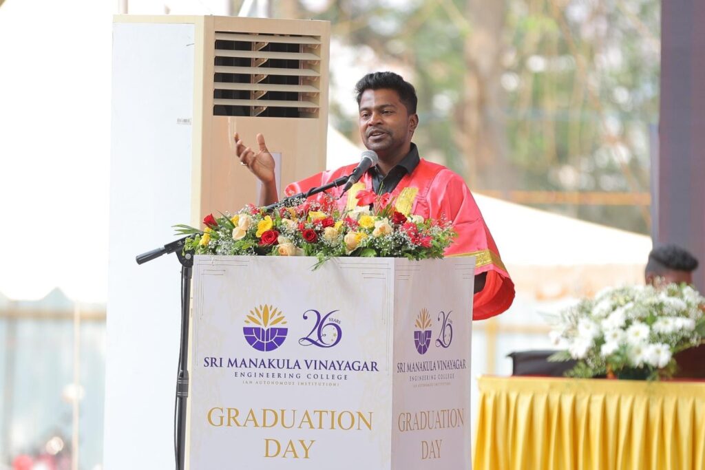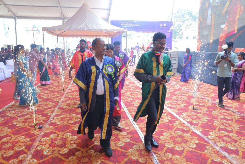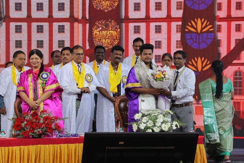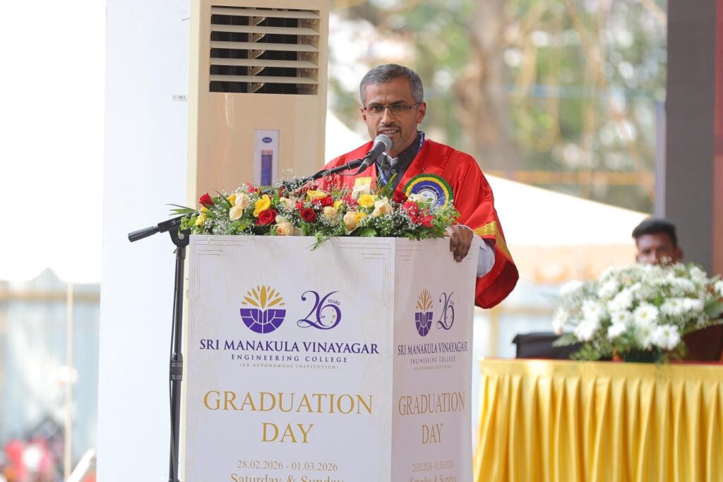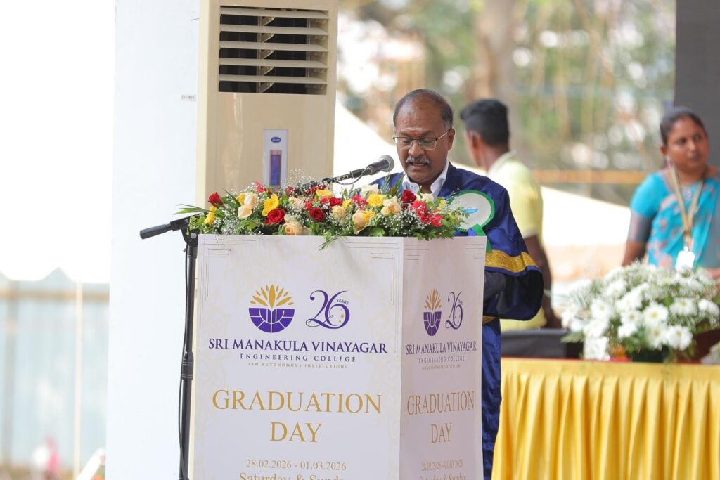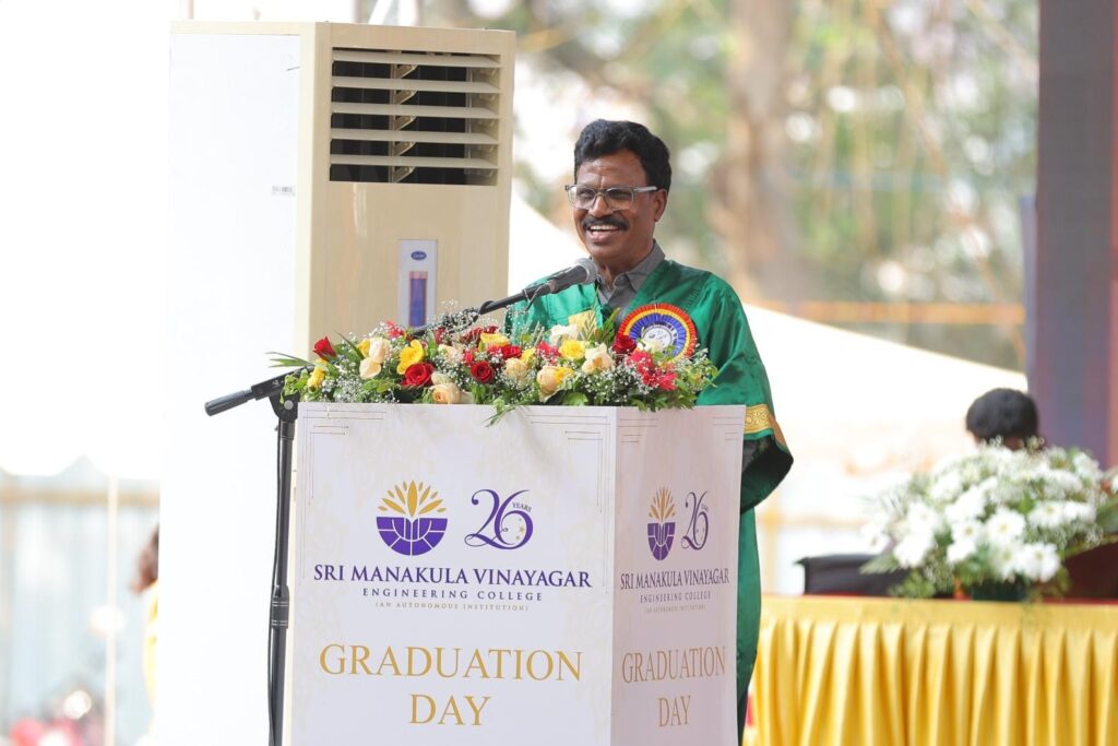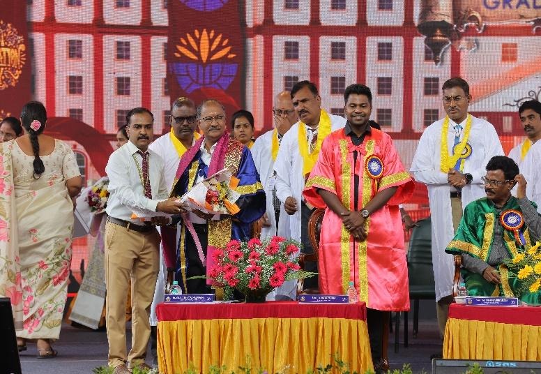 The Presidential Address was delivered by Shri M. Dhanasekaran, Chairman and Managing Director, who warmly greeted the dignitaries, graduates, parents, and faculty members present at the ceremony. In his address, he encouraged the graduates to listen carefully to the insights shared by the Chief Guest and Guest of Honour, emphasizing that their experiences would guide students in building successful careers. He also advised graduates to approach their work with a positive attitude, avoid unnecessary complaints, and focus on learning and growth in their professional journey. He concluded by motivating the students to remain dedicated, work sincerely, and make meaningful contributions to society.