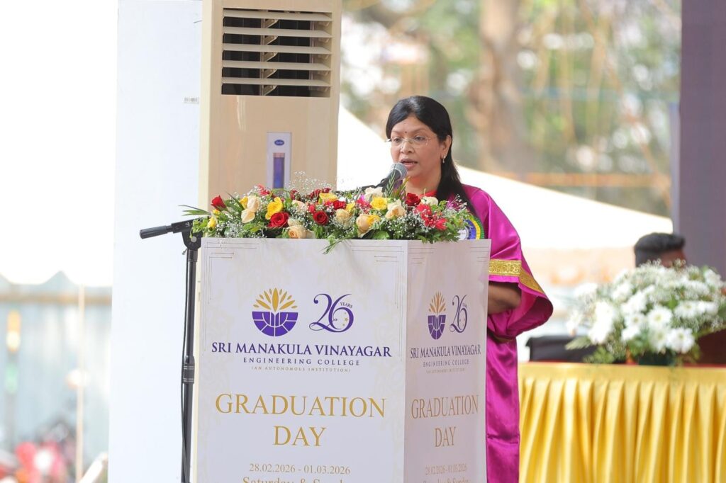 The Guest of Honour Address was delivered by Mrs. Anuradha Muthuswamy, Vice President and Delivery Leader, Wipro Engineering, Wipro Limited, who shared valuable insights on the rapidly evolving technology landscape. She emphasized the importance of continuous learning, adapting to emerging technologies such as Artificial Intelligence, and strengthening engineering fundamentals to stay relevant in today’s dynamic industry. She encouraged graduates to remain curious, embrace change, and focus on building impactful solutions that contribute to both industry and society. She concluded by congratulating the graduates and wishing them success in their professional journey.