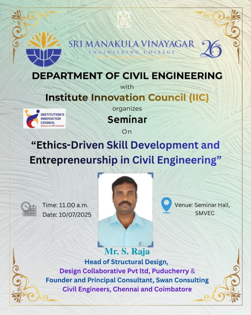 Department of Civil Engineering, Sri Manakula Vinayagar Engineering College (Autonomous), Madagadipet, Puducherry, organized a seminar titled “Ethics-Driven Skill Development and Entrepreneurship in Civil Engineering” by Er. S. Raja, Proprietor, in offline mode at the Seminar Hall, for two hours (11:00 AM to 01:00 PM). The programme aimed to encourage students to understand the importance of ethical practices, skill enhancement, and entrepreneurship in civil engineering.