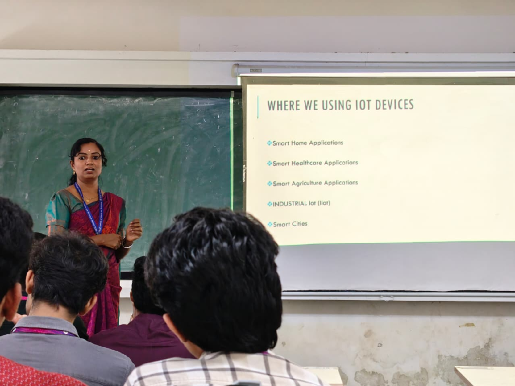 The session also addressed practical challenges such as power management, latency, device scalability, and system security. Dr. Sageengrana S stressed the importance of cybersecurity in IoT deployments, highlighting common vulnerabilities and basic protection strategies.