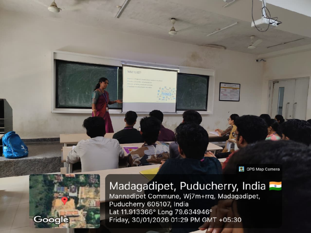 The event was sponsored by Sri Manakula Vinayagar Engineering College, Puducherry, and conducted in offline mode for a duration of two hours. The session was delivered by Dr. 5Sageengrana S, Assistant Professor, Department of Computational Intelligence, SRM Institute of Science and Technology, Kattankulathur. The lecture aimed to bridge the gap between classroom learning and real-world applications by providing students with practical insights into IoT architectures, embedded platforms, and smart system design methodologies.