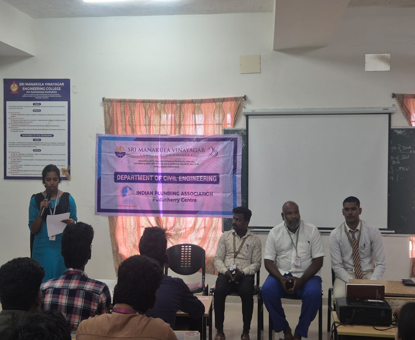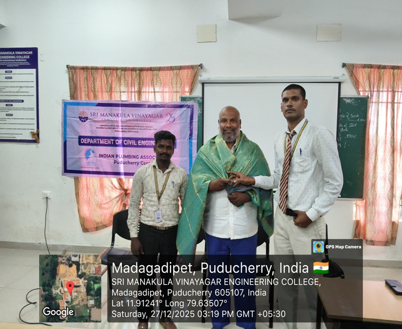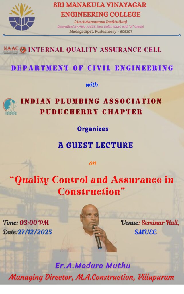 The Department of Civil Engineering, Sri Manakula Vinayagar Engineering College (SMVEC), in association with the Indian Plumbing Association, successfully organized a Guest Lecture on the topic “Quality Control and Assurance in Construction” on 27th December 2025 (Saturday). The program was conducted for the benefit of second and third year Civil Engineering students with the objective of enhancing their understanding of quality management practices followed in the construction industry. The session was held at the Engineering Block Seminar Hall (3rd Floor) and commenced at 03:00 PM.