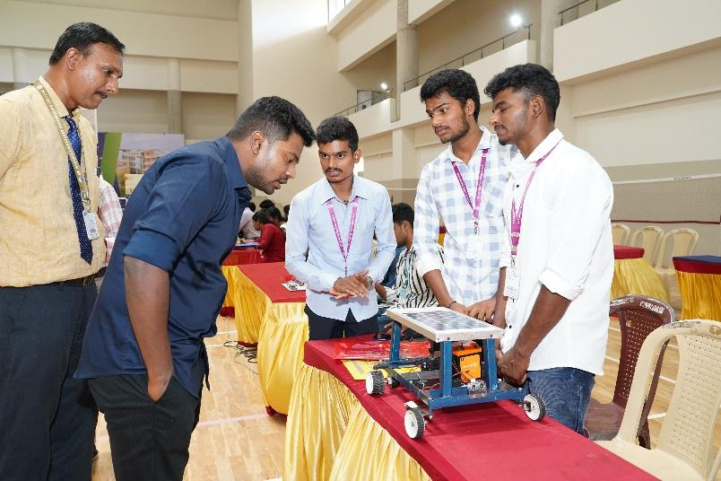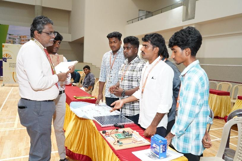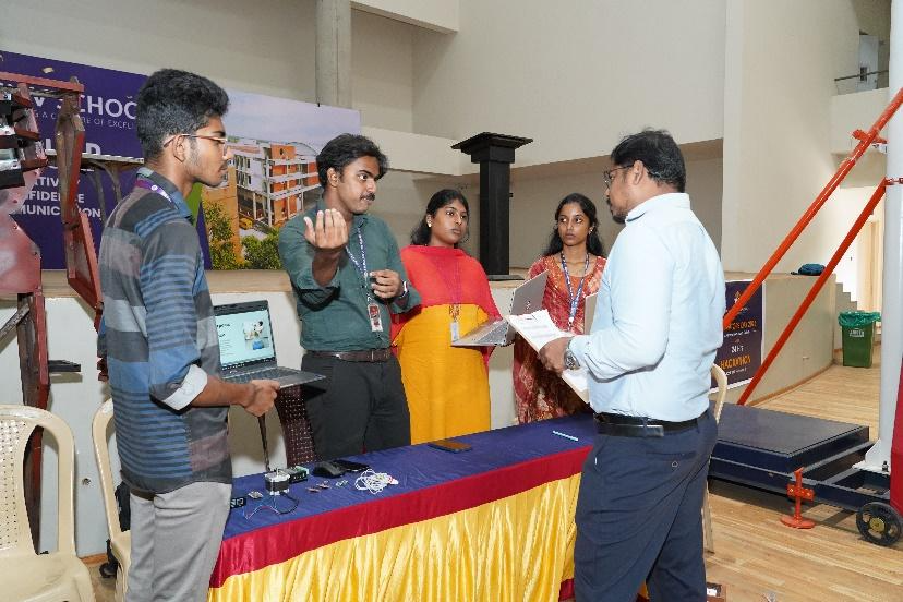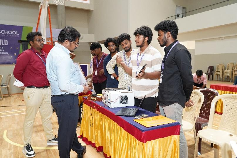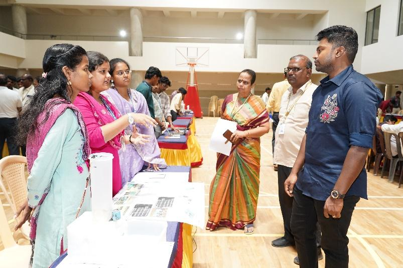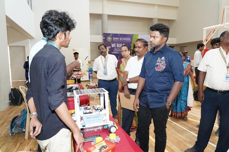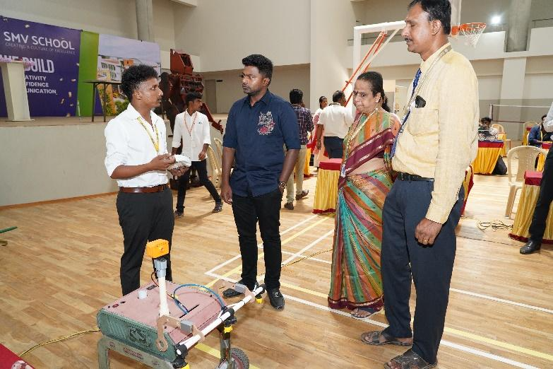 Participants proudly demonstrated their projects in front of a large audience. The atmosphere was vibrant as Mr. S. Velayudham, Joint Secretary of SMVET, the Chief Guest, faculty members, and staff visited each exhibit.