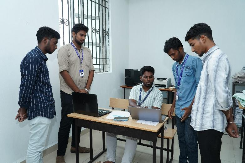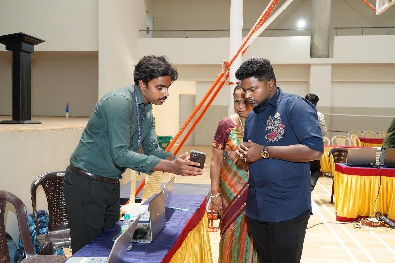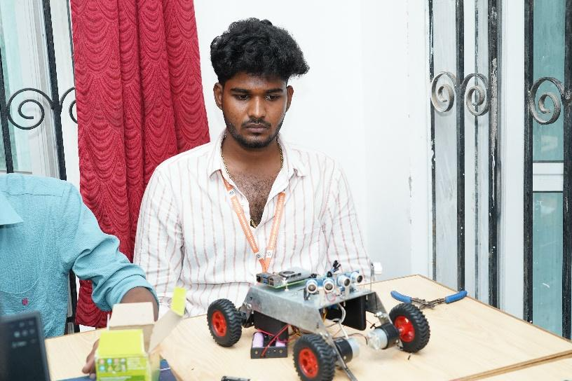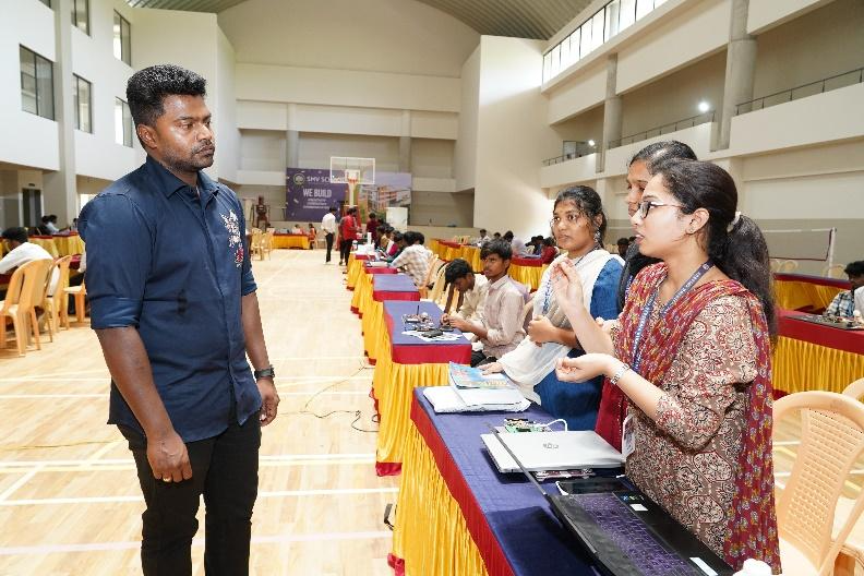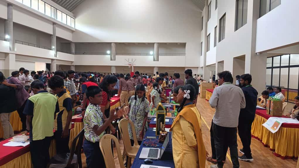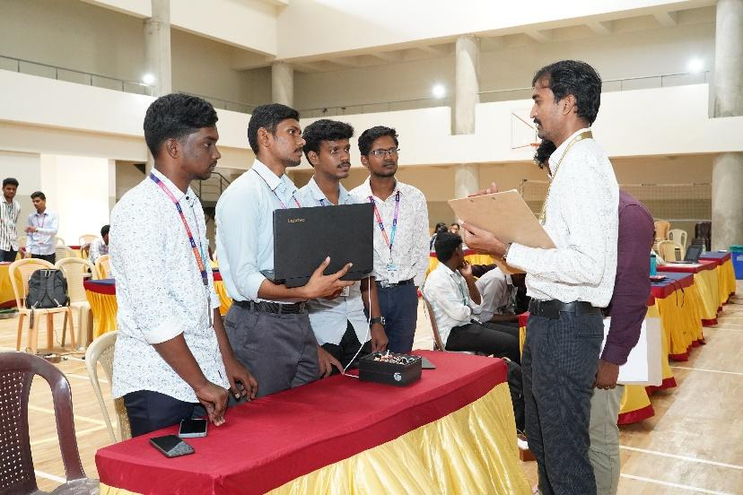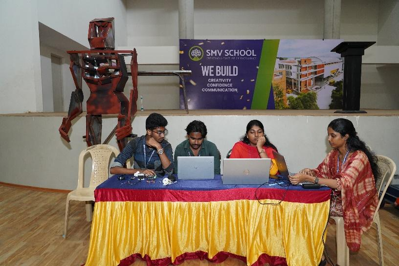 Participants proudly demonstrated their projects in front of a large audience. The atmosphere was vibrant as Mr. S. Velayudham, Joint Secretary of SMVET, the Chief Guest, faculty members, and staff visited each exhibit.