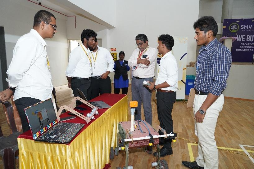 Adding prestige to the event, Shri. D. Rajarajan, Treasurer of SMVET, visited the project showcase. He carefully observed the exhibits, interacted with the participants, and appreciated their dedication and innovative spirit. His presence motivated students to think beyond academics and pursue innovation as a passion.