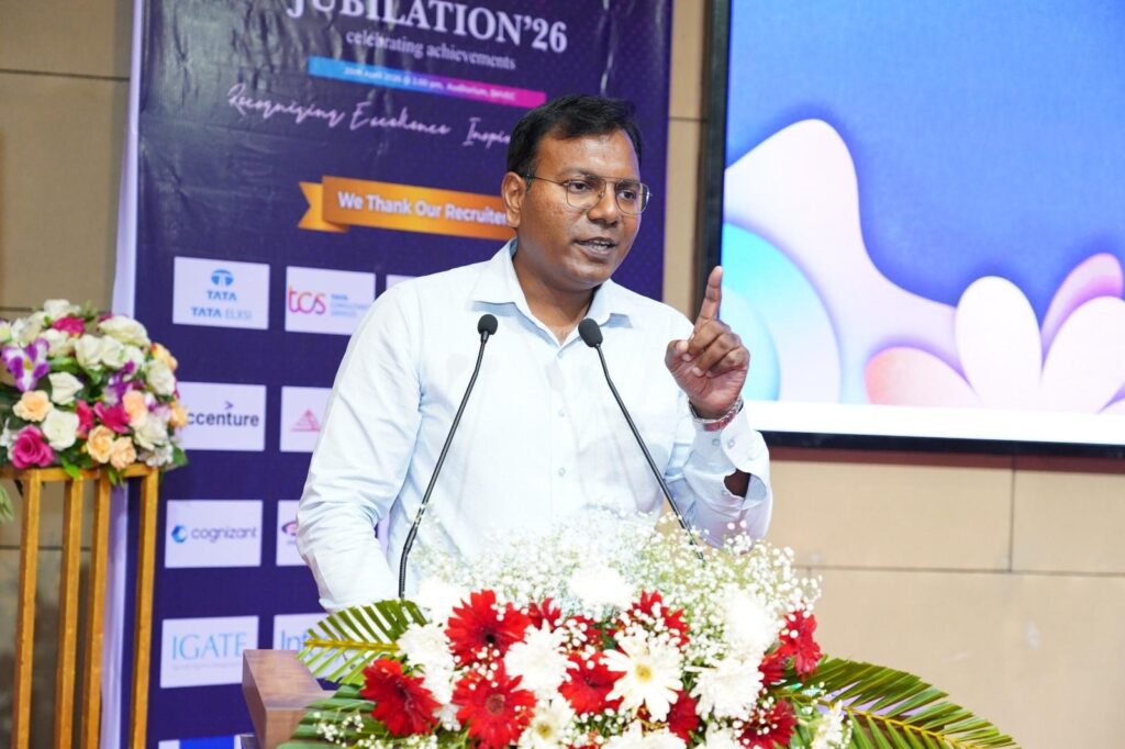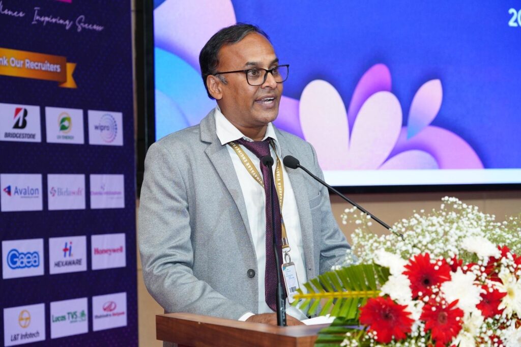 The Placement Report was presented by Dr. N.S.N. Cailassame, Dean – Placement, highlighting key achievements of the placement activities. He shared that over 750 offers were made, with more than 700 students placed in top companies, with packages reaching up to 18 LPA. He also mentioned collaborations through MoUs with more than 83 companies and participation of over60 companies in recruitment. He appreciated the support of management, faculty, and industry partners in achieving this success. He concluded by expressing confidence in students’ future growth and accomplishments.