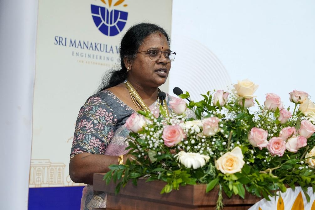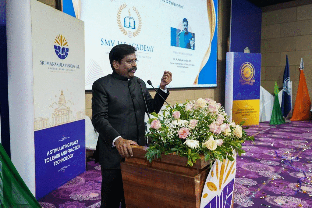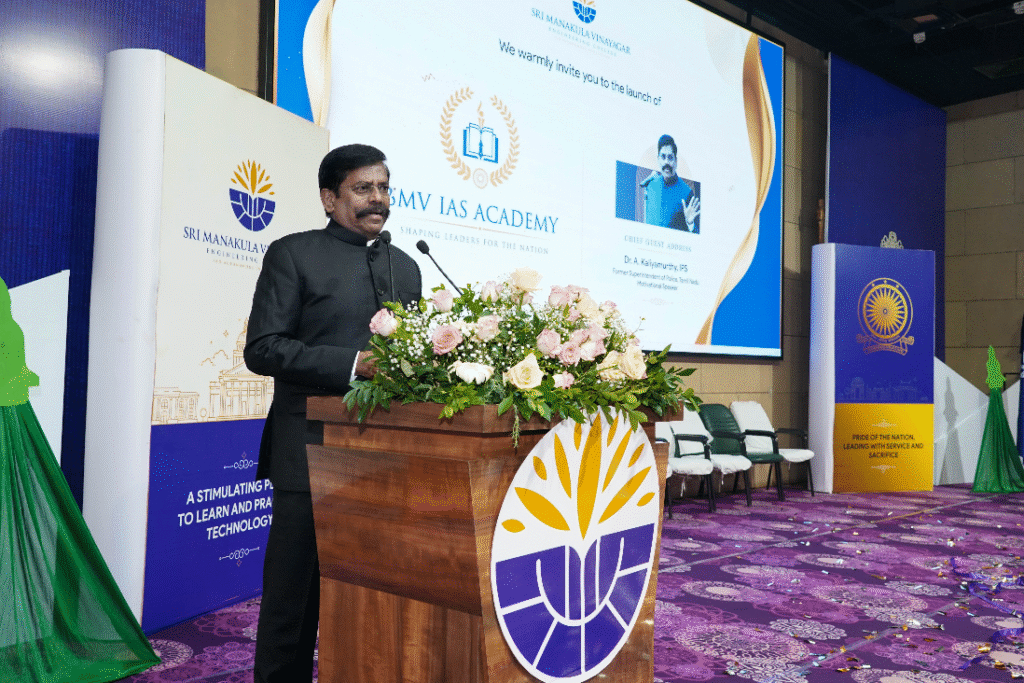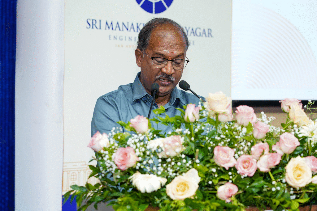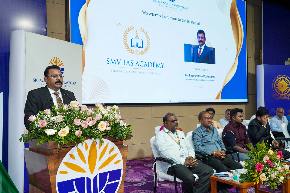 The Felicitation Address was delivered by Mr. M. Boominathan, Managing Director of KingMakers IAS Academy. In his speech, he expressed his happiness, stating that this initiative has created a movement encouraging students to attempt and succeed in the Indian Civil Services examination. He credited Sri Manakula Vinayagar Educational Trust for this achievement. He pointed out that the students trained here would shape the future as teachers, doctors, scientists, and more. He also expressed confidence that this initiative would set an exemplary model for Tamil Nadu. He underlined the importance of self-confidence, dedication, and meaningful contributions in every field, emphasizing that collective efforts bring about change.