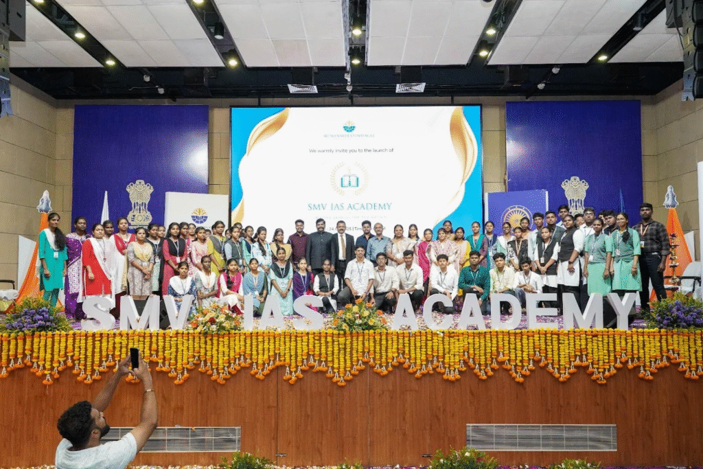 A significant highlight of the launch event was the unveiling of the official SMV IAS Academy logo. The logo, thoughtfully designed to represent the academy’s commitment to excellence, knowledge, and leadership, was revealed to great applause from the audience. It symbolizes the academy’s vision to empower future civil servants with the skills and values needed to serve the nation with integrity and dedication. The unveiling marked a proud moment for the entire SMV IAS Academy community, reflecting a new chapter filled with promise and ambition.