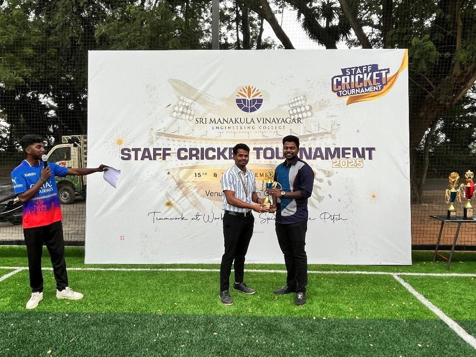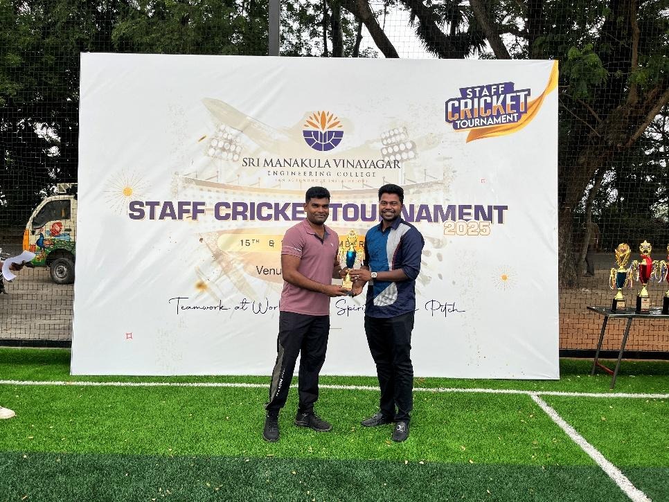 The All-Rounder Trophy was awarded to Ar. Ragavendira from the School of Architecture for outstanding individual performance in both batting and bowling. His consistent contribution and versatility on the field made a significant impact for his team and earned him this prestigious recognition.